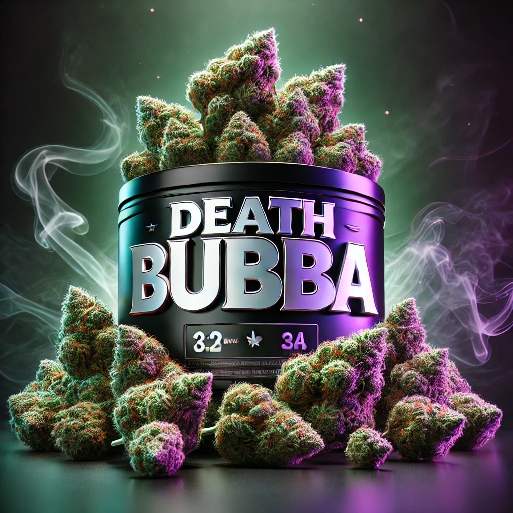 Death Bubba is a cross between Bubba Kush and Death Star. It is an Indica dominant hybrid with an average THC content of 27%. This strain has the aroma of a pinecone and has the flavor combinations of citrus lemon and spiced rum.