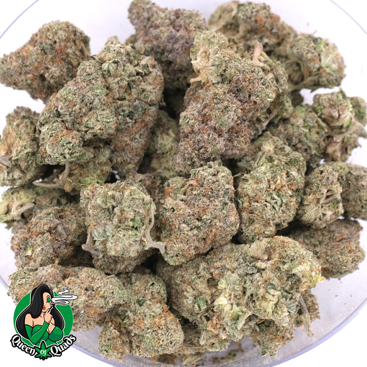 Visually, Frozen Grapes stands out with dense, frosty buds coated in thick trichomes, showcasing deep green tones, purple hues, and bright orange pistils—true top-shelf bag appeal.
