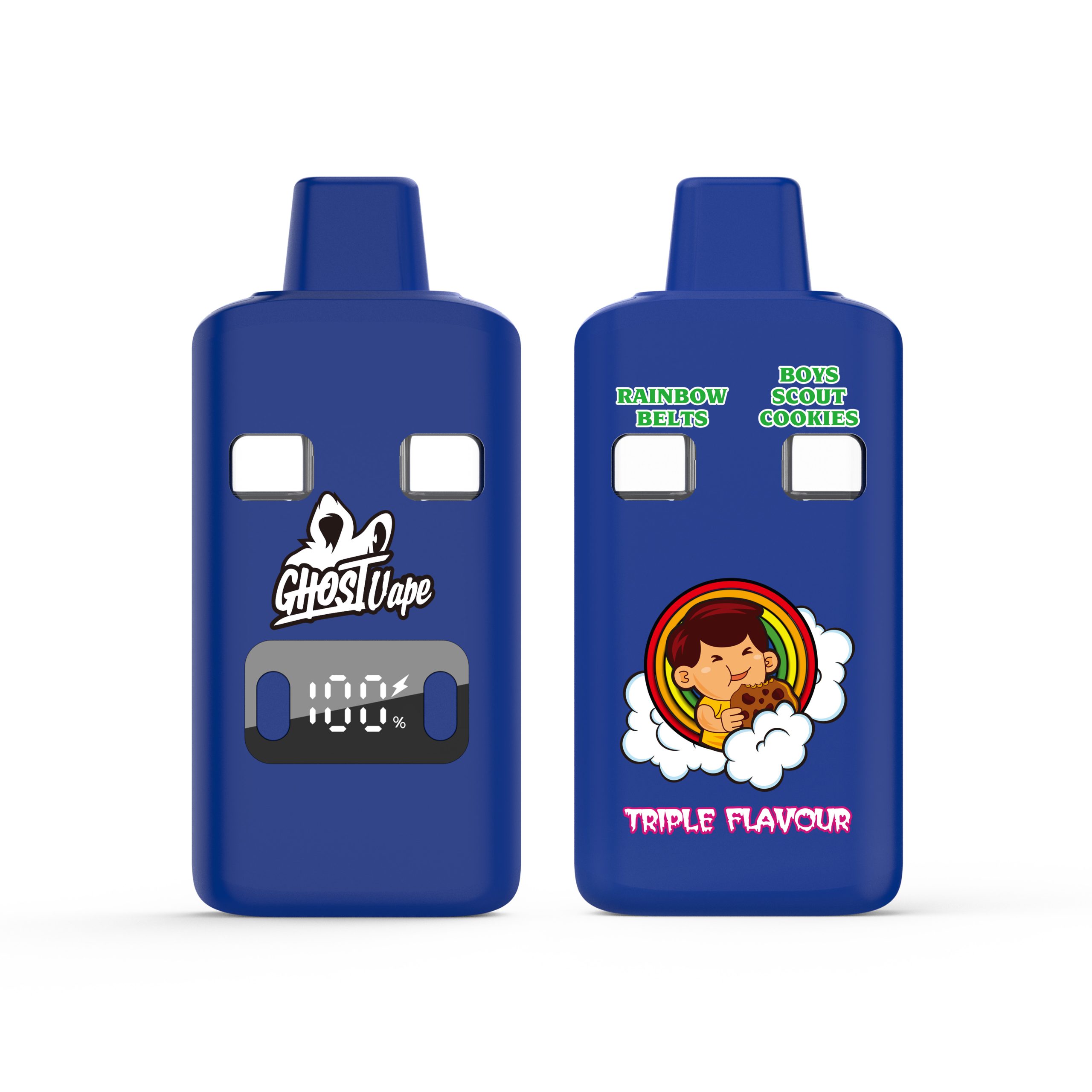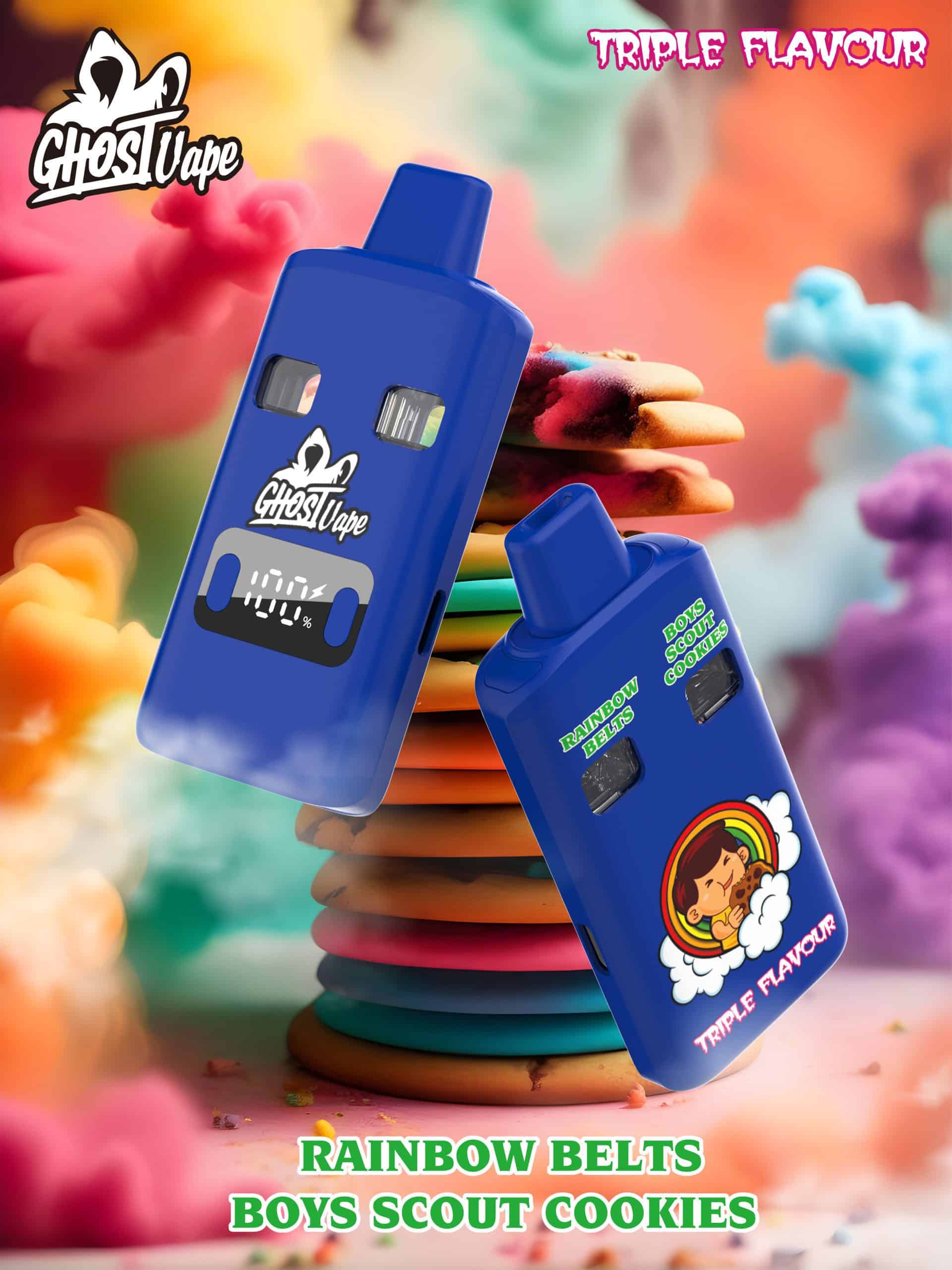 Experience the vibrant and delicious fusion of Rainbow Belts and Boys Scout Cookies with this advanced THC vape by Ghost Vapes. Infused with 2000mg of premium Delta-9 distillate, this vape offers two mouthwatering options: the fruity, candy-inspired sweetness of Rainbow Belts and the rich, earthy tones of Boys Scout Cookies. With the ability to switch between flavors or inhale both simultaneously, it provides a customizable and potent vaping experience.