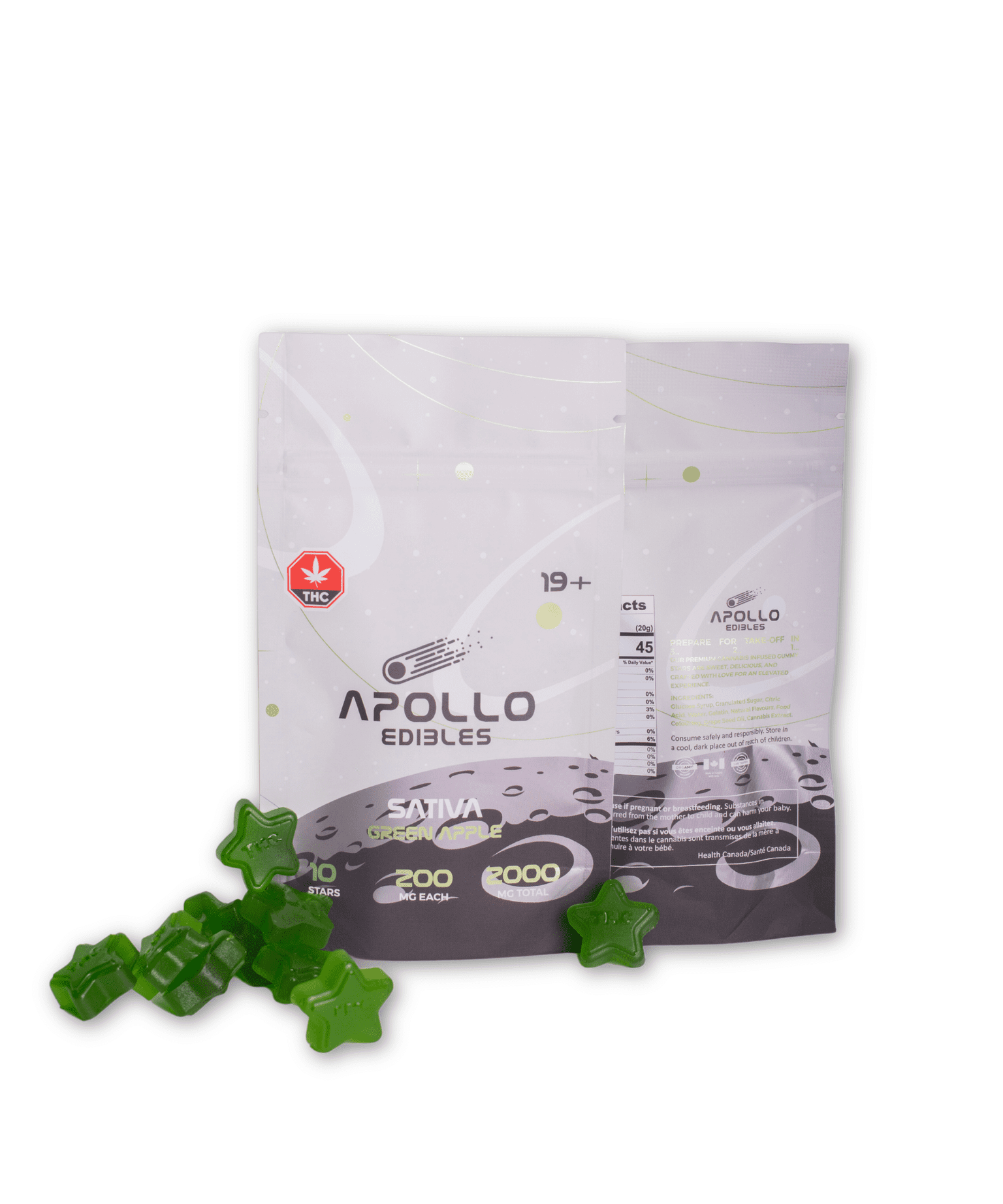 Our strongest gummies yet. Blast off to a new galaxy with a high dosage of Apollo Shooting Stars Gummies made locally in British Columbia. Crafted with premium quality ingredients and top of the line THC oil, these SATIVA Green Apple gummies are the boost of flavour you’re looking for in outer space. We recommend dividing up these highly potent stars even for experienced users. Get ready to take off!