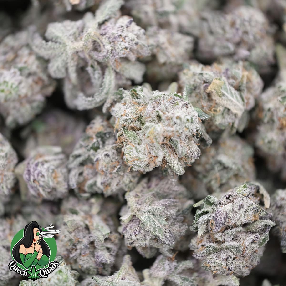 Jealousy’s dense, frosty buds feature a mix of dark green and purple hues with orange pistils and a thick coating of trichomes, showcasing its potency and bag appeal.