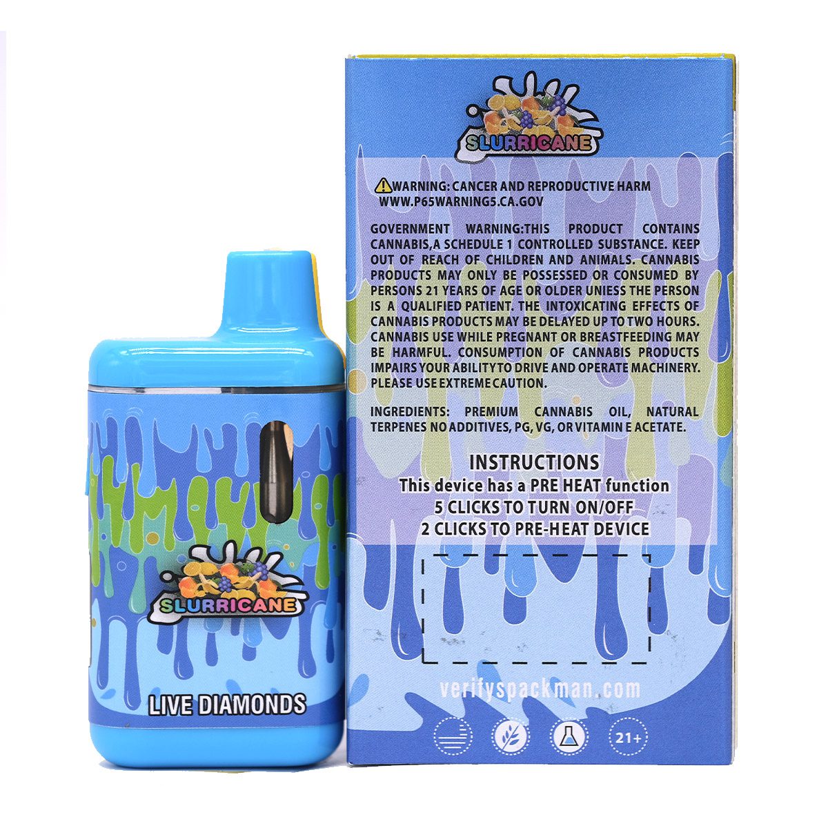 Indulge in the luxurious taste and potent effects of Pack Man Slurricane 2 Gram Live Diamonds Cannabis Oil Vape. Perfect for those seeking a deeply relaxing and flavorful vaping experience, this cartridge promises satisfaction with every puff.
