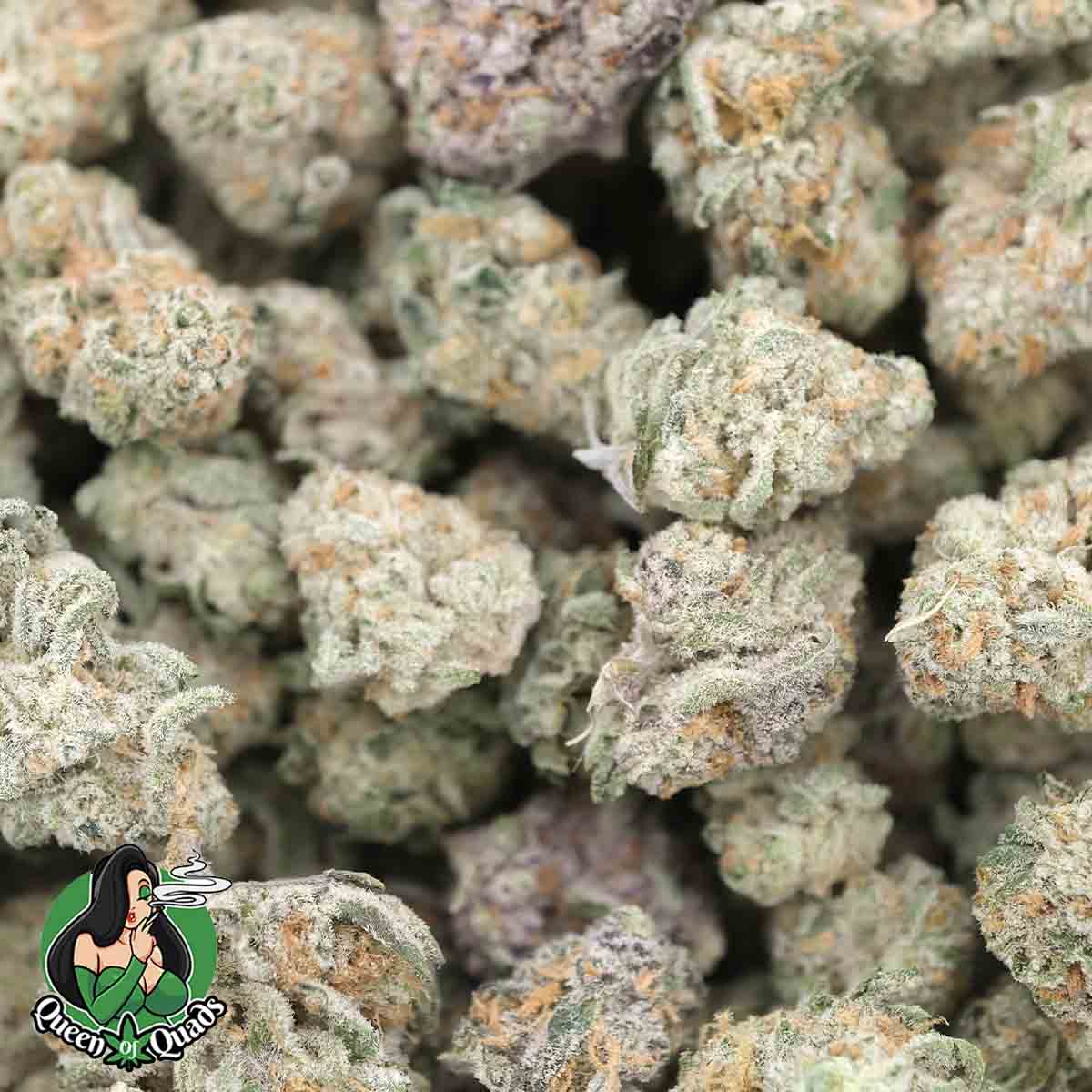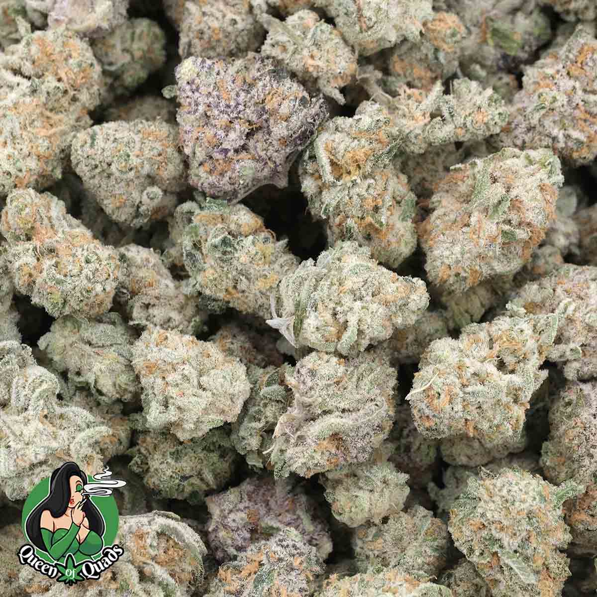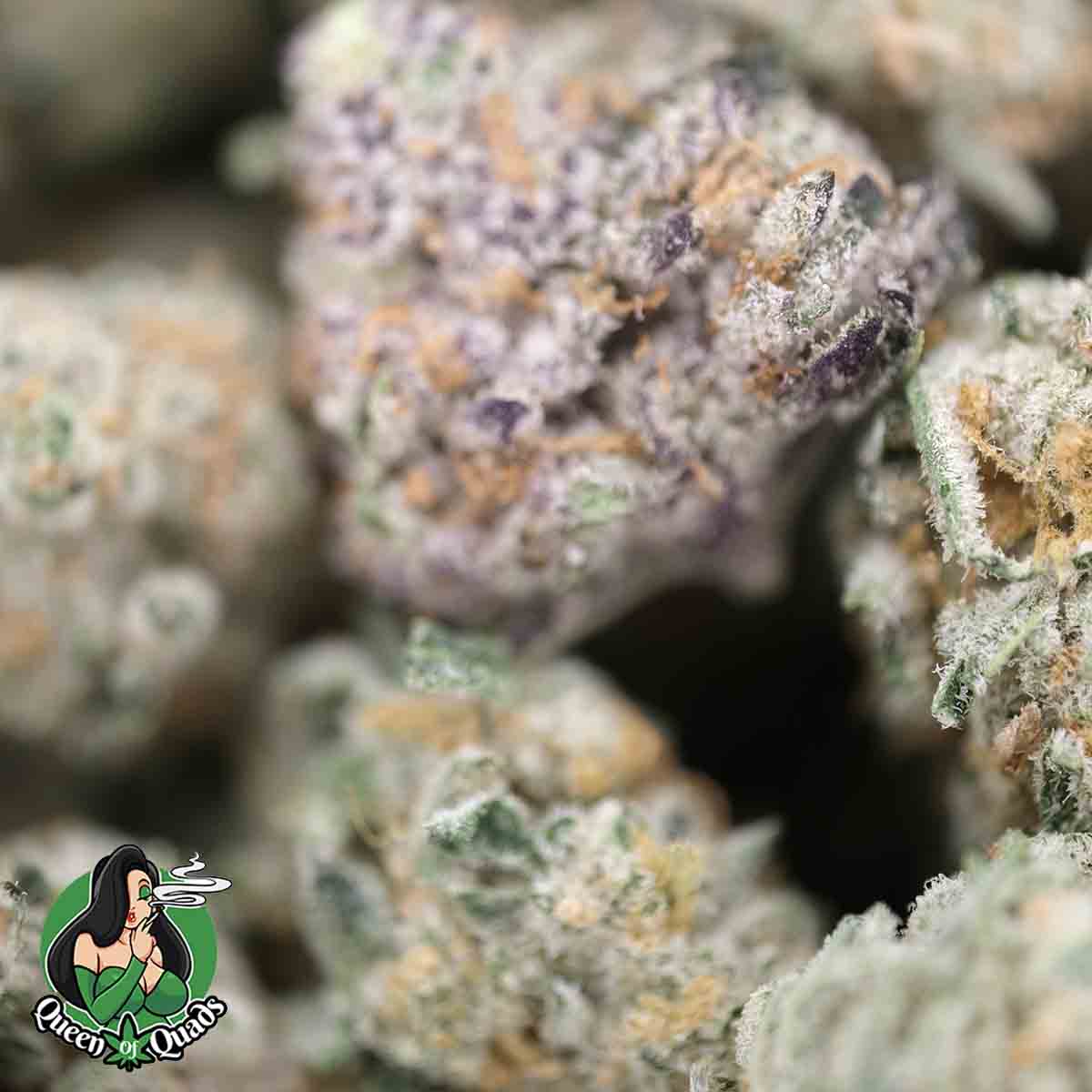 Its buds are dense, sticky, and visually stunning, featuring vibrant green hues, delicate purple undertones, and bright orange hairs, all generously dusted with glistening trichomes that highlight its potency and quality.